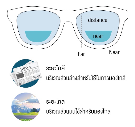ลักษณะเลนส์สองชั้น สำหรับอ่านหนังสือหรือเลนส์มองใกล้ เป็นรูปครึ่งวงกลมหรือครึ่งเสี้ยวพระจันทร์ สามารถเคลือบสาร Hard Coated, UVX Multicoated หรือ Photo lensได้มีทั้งกระจกและพลาสติก