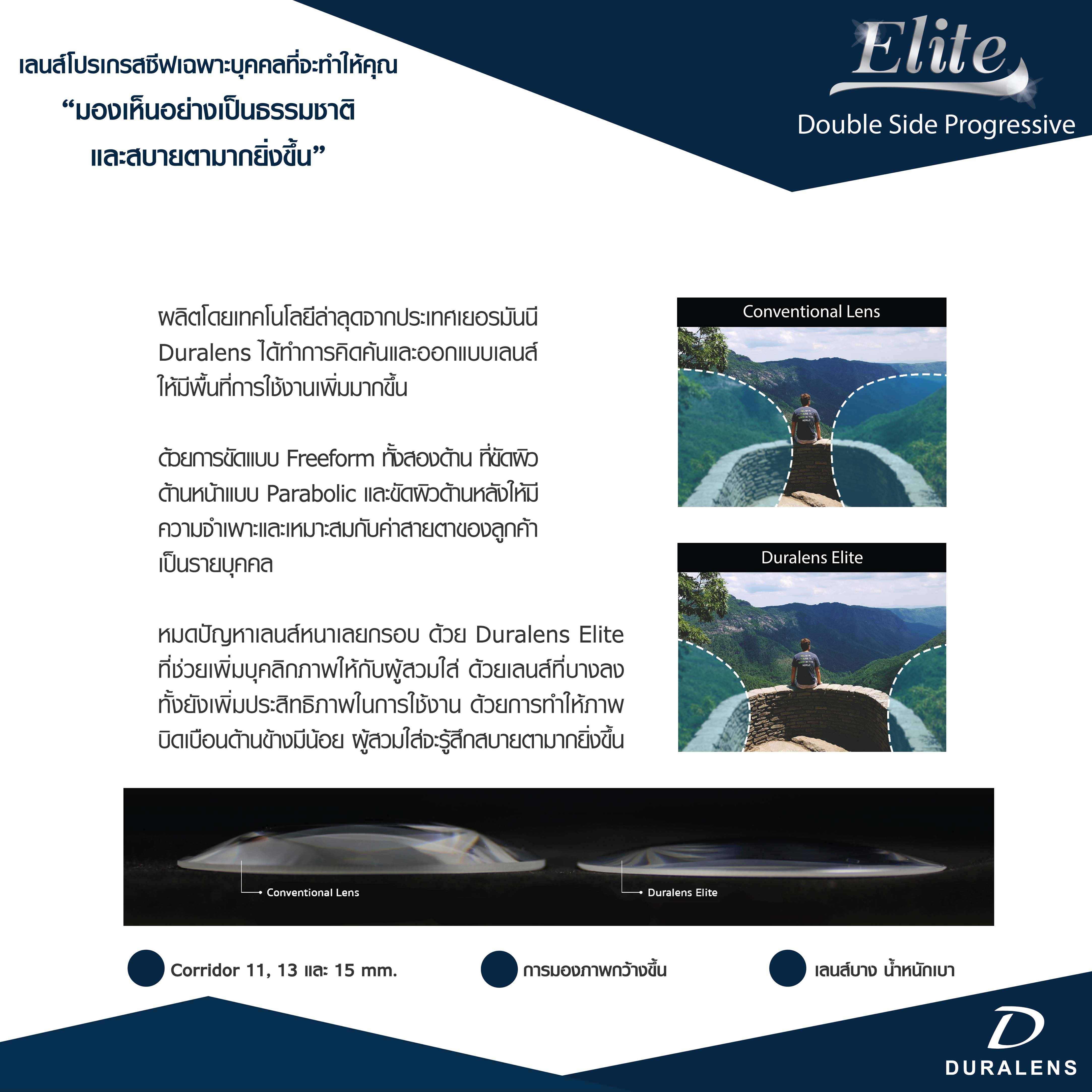 Elite เลนส์โปรเกรสซีฟ Double Side Progressive ผลิตโดยเทคโนโลยีล่าสุดจากประเทศเยอรมันนี Duralens ได้ทำการคิดค้น และออกแบบเลนส์ให้มีพื้นที่การใช้งานที่เพิ่มมากขึ้น ด้วยการขัดแบบ Freeform ทั้งสองด้าน ขัดผิดด้านหน้าแบบ Parabolic และขัดผิดด้านหลังให้มีความจำเพาะและเหมาะสมกับค่าสายตาของลูกค้ารายบุคคล