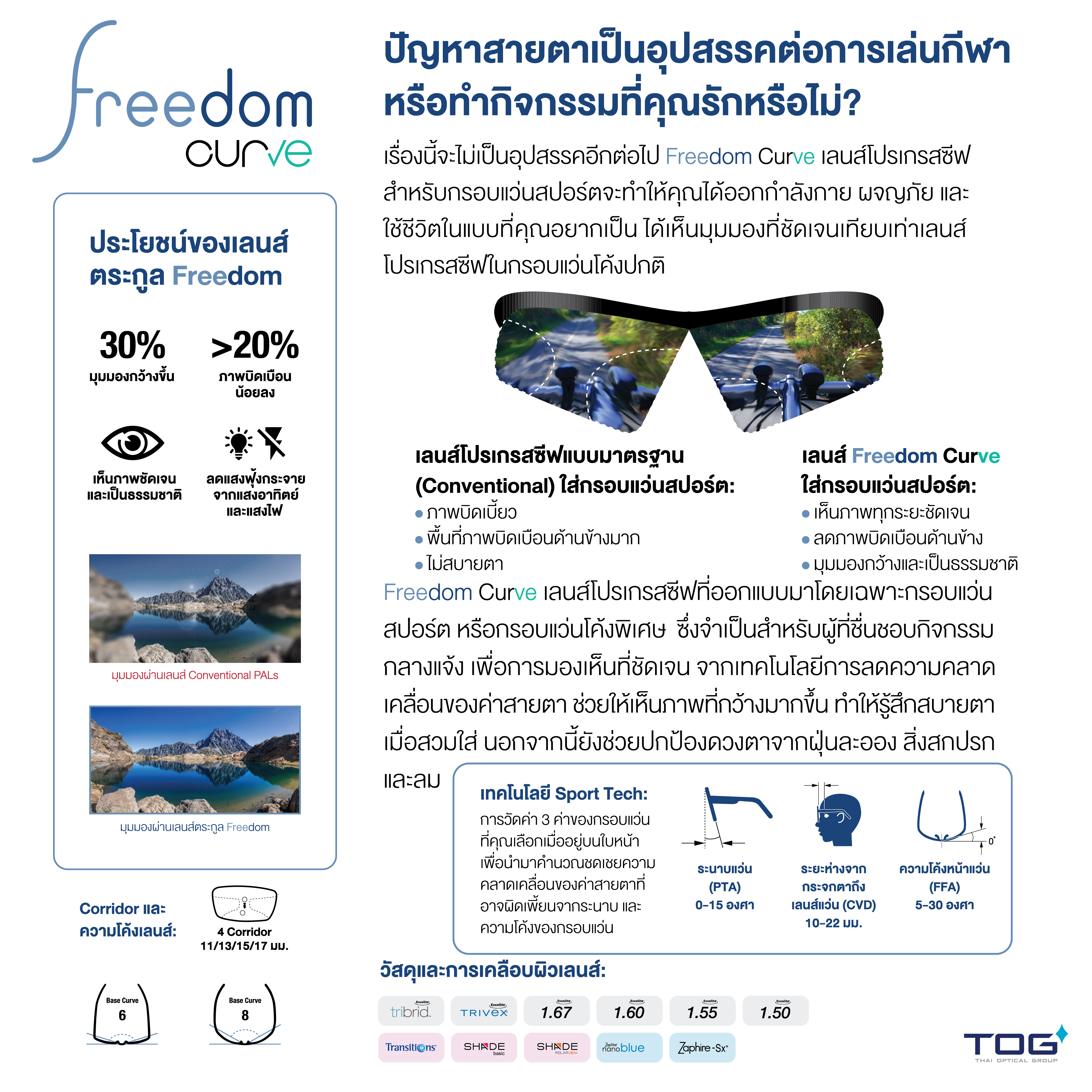 เรื่องนี้จะไม่เป็นอุปสรรค์อีกต่อไป Freedom Curve เลนส์โปรเกรสซีฟสำหรับกรอบแว่นสปอร์ตจะทำให้คุณได้ออกกำลังกาย ผจญภัย และใช้ชีวิตในแบบที่คุณอยากเป็น ได้เห็นมุมมองที่ชัดเจนเทียบเท่าเลนส์โปรเกรสซีฟในกรอบแว่นโค้งปกติ