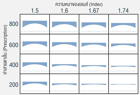 เลนส์ที่ย่อบางจะได้รับการบีบอัดเลนส์ทำให้ตัวเลนส์มีความบางมากขึ้น ยิ่งมีกำลังหักเหมากจะยิ่งถูกบีบอัดมากทำให้ Index สูงขึ้นเรื่อย เพราะฉะนั้นเวลาไปร้านแว่น คนขายที่พูดว่า 1.6 หรือ 1.74 อันนั้นหมายความเป็นเลนส์ที่ย่อบางแล้ว ตัวเลข Index ยิ่งเยอะ เลนส์ยิ่งบาง